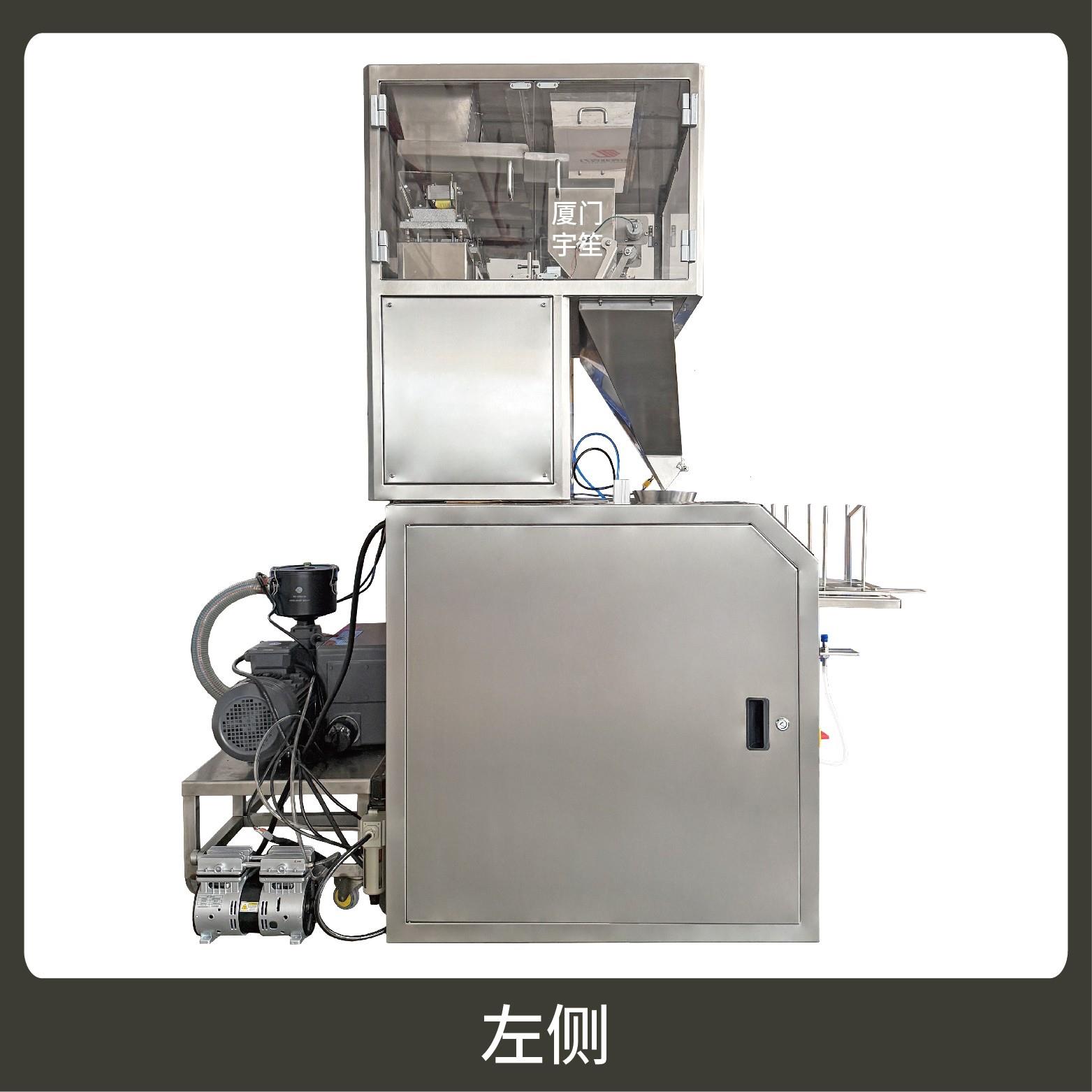 包裝流程全自動,可抽真空(真空度可達到-0.1Mpa)??筛鶕?jù)充填物料的性質(zhì)選配不同的下料結(jié)構(gòu)。